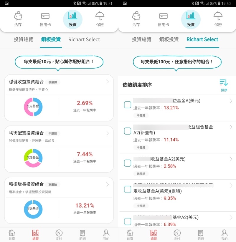 投資的部份阿湯去年還沒特別注意,今年注意看時才發現,原來各種投資產品都有列出去年一整年的投資報酬率為幾趴,已經幫大家整理過濾了不錯的產品,也已經區分好高中低風險類別讓你自由選擇,對於阿湯這種保守型投資比較沒研究的人來說是大大的幫助,今年已經開始考慮要透過 Richart 購買投資產品了。