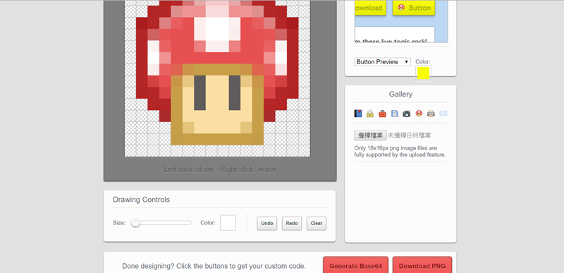 再看一下 Icon 的部分,可置入檔案或拖入範例,尺寸、顏色也很好調整,最後除了可存 PNG 圖檔還能生成 Base64。