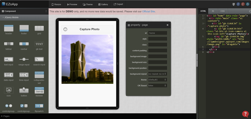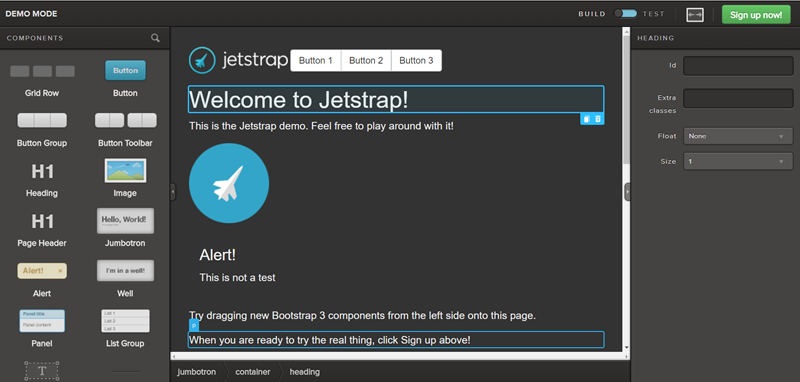 阿湯也是不註冊先看看試用版功能,這款介面除了從左邊拖入設計外,右邊也會顯示 HTML、CSS、JS 代碼。