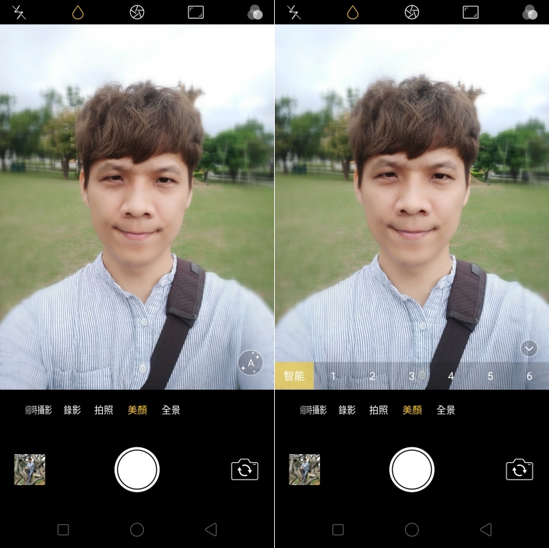 如果不想啟用 AI 智慧美顏也可以自己選擇要美顏的等級(阿湯覺得自動的處理的蠻好的)。哦對了,這只是截圖,實拍請往下。