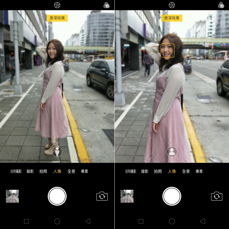 人像模式的最大重點就是景深效果,當手機與主體的距離符合條時,就會在上方出現黃底黑字的「景深效果」四個字,這時拍攝的照片就會附帶景深效果,同時可以選擇全身或是半身,大家可以依需求切換使用,畫質同樣沒有差異。
