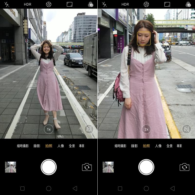相機的介面非常的直覺,左右滑動可以切換模式,不論主鏡頭或前鏡頭都可以開啟美顏模式,內建的模式包括縮時攝影、錄影、一般拍照、人像模式、全景以及專業模式。 在一般拍照模式下,仍然可以切換 1 倍與 2 倍的焦段,原本阿湯以為只是利用「裁切」的方式得到 2 倍焦段,後來拍攝後查看相片資訊,解析度同樣是 4608x3456 的 1600 萬像素照片,因此推測是在 2 倍模式下是拍攝多張照片後進行合成所得到的照片,畫質幾乎沒有任何影響。