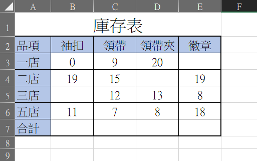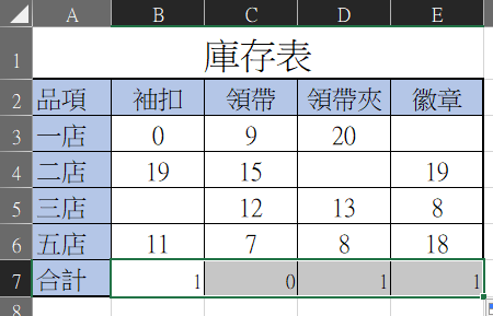 先用這個簡單的庫存表做示範,假設在「合計」的地方要計算的是「空白」的數量,而不是平常用的數字加總,該怎麼辦呢?