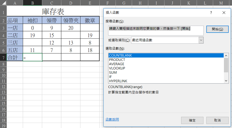 插入函數並選取「COUNTBLANK」,如果沒用過就不會出現在下方列表,要輸入文字來搜尋,點確定。