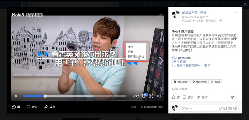 怕有人忘了臉書影片不是用最上面的網址列,阿湯重頭示範一次,先到你要下載的頁面,對著影片隨便一個地方按右鍵,出現「顯示影片網址」。