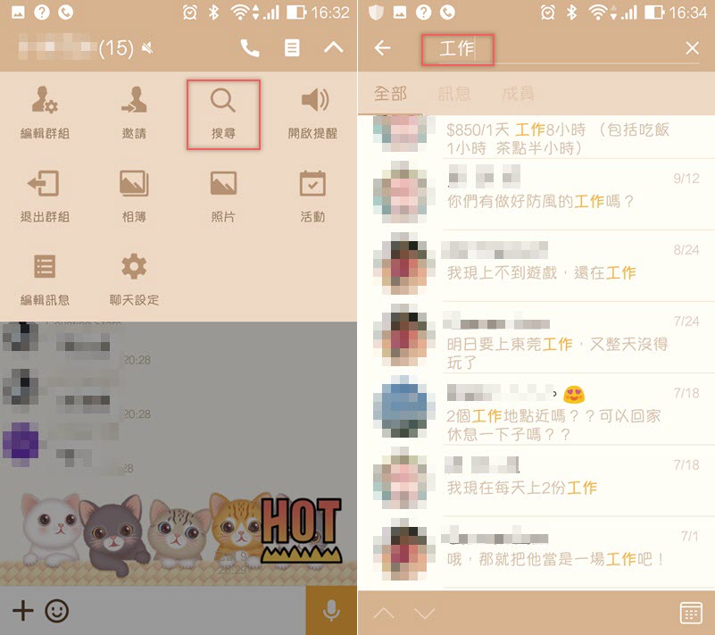 再來是聊天室搜尋,這項在 iOS 版已推出了,打開聊天室右上角點「搜尋」,輸入關鍵字後就會馬上列出有這個字詞的訊息,找起來相當方便。