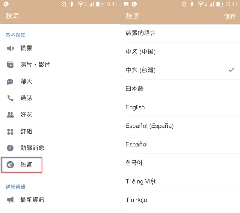 LINE 的介面預設是你的裝置語言,如果想更改就進入設定 → 語言,再選擇要更改的項目即可。