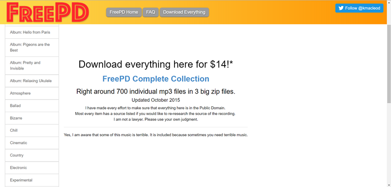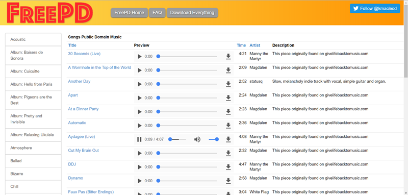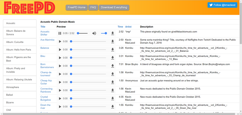 介面很簡單,音樂標題、時間長度、作曲家 ∕ 歌手、簡介,點播放線上聽、喜歡就點下載,左邊可切換選擇類別。