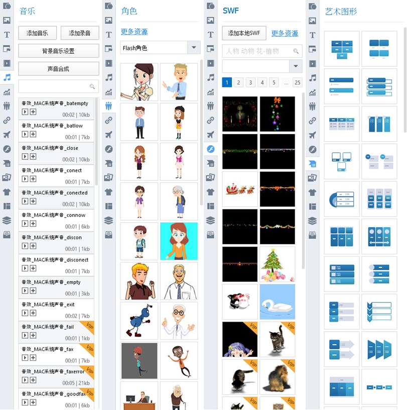 來看一下可加進去的素材,包括音樂、角色、SWF、藝術圖形等,還有圖示、版型、圖層選項,資源相當豐富。