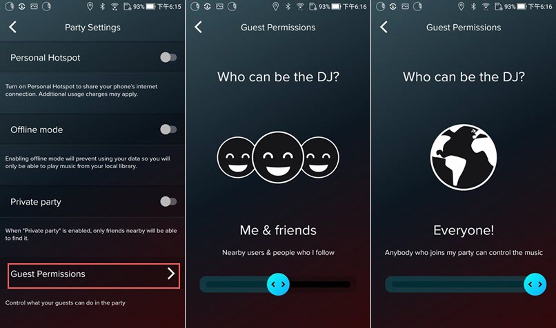 在設定區可調整你的 Party 歌單只能自己聽(當播放器)、跟朋友分享或陌生人都能搜尋,也能設定誰有 DJ 的權力,建議用朋友,如果是所有人可能就要擔心聽一聽被換歌或暫停之類。
