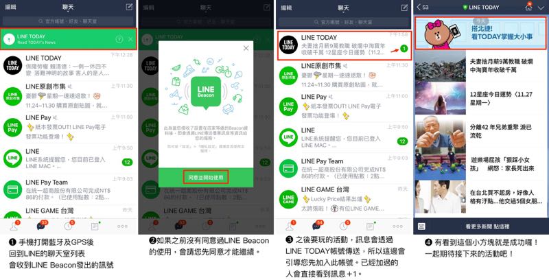 如果想要收到 LINE Beacon 的訊號,我們必須先找到有著小綠盒的地方,將手機打開藍牙與 GPS,這時回到 LINE 的聊天室後就會收到 LINE Beacon 所發出的訊號。接著在同意 LINE Beacon 的使用後,加入 LINE TODAY 帳號,進入 LINE Today 視窗看到上方的「搭北捷,看 TODAY 掌握大小事」的圖,就算完成!