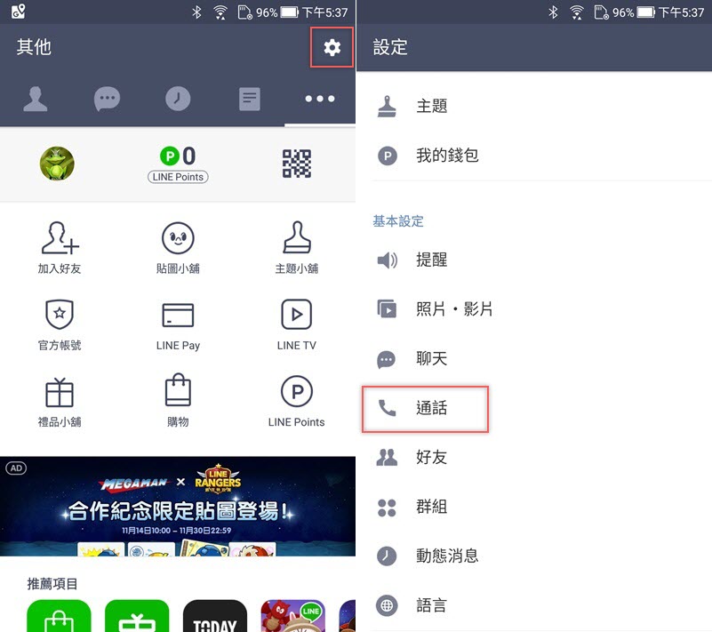 很簡單,打開右上角設定區,再到「通話」。