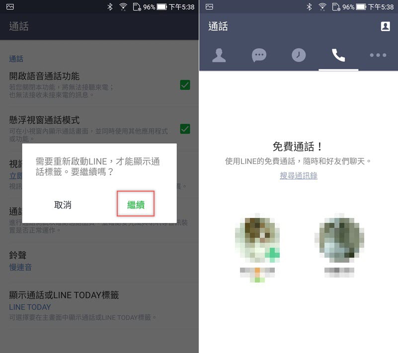 需要重新啟動,點繼續,重開後就會看到上排圖示已經更新了,點進來就是通話頁面,以後除了個別的對話視窗也可以從這邊打 LINE 電話,討厭 LINE TODAY 的新聞顯示就來更改吧。