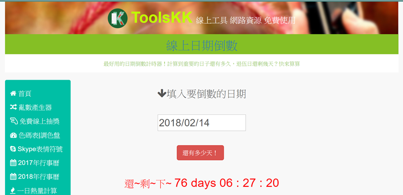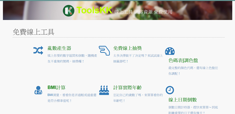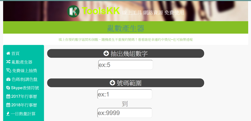 Facebook 粉絲團留言抽籤小助手」,如果不是粉絲團的活動或想用簡單一點的方式,可以使用「ToolsKK 線上工具網」,有適用於抽獎的亂數產生器及線上抽籤,還有各種單位換算、尺寸對照、色碼表,也有注意身材的朋友需要的 BMI 指數計算、一天熱量所需,以及 2018 行事曆、特殊表情符號、常用英文縮寫等綜合性的生活內容,一個網站全部滿足。