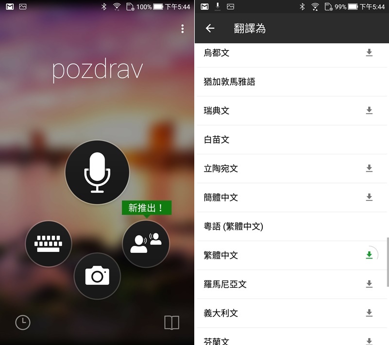 主畫面就是目前的四大功能:鍵盤輸入、麥克風口說、拍照翻譯,以及最新的多人多語言對話翻譯,如果需要離線使用,可在連網的時候先下載相關語言,目前支援 60 多種不同語系。