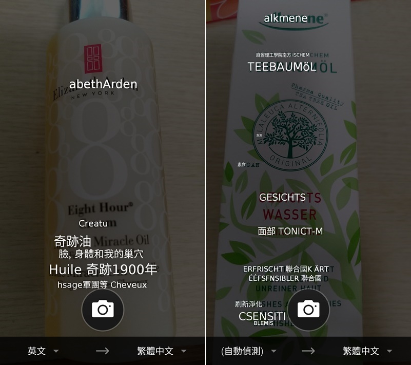 拍照翻譯的部分就比較弱了,物體反光、非標準字(藝術字等)不能用之外,無論自動偵測或設定好英翻中,出來都怪怪的。