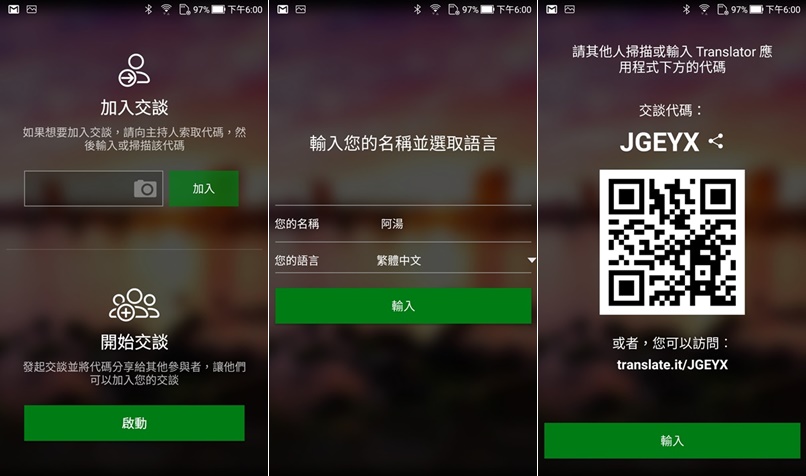 來看多人會議,掃描代碼加入或自己開一個,如果是發起談話的主持人,先輸入名稱及自己講的語言,產生代碼後請與會的大家掃描加入。