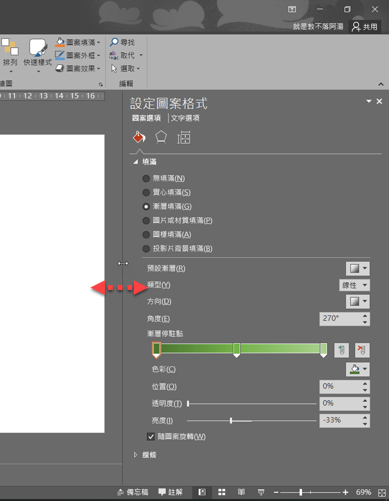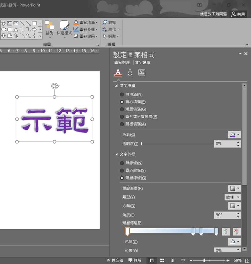 格式視窗能做的事很多,除了對圖案進階設定,如果置入的是文字也能一併處理,包括各式填滿效果、外框類型色彩等等,跟圖案一樣能調整的細節非常豐富,大家玩玩看吧,阿湯蠻想看到有人用 PowerPoint 繪製出可媲美繪圖軟體、厲害的作品。