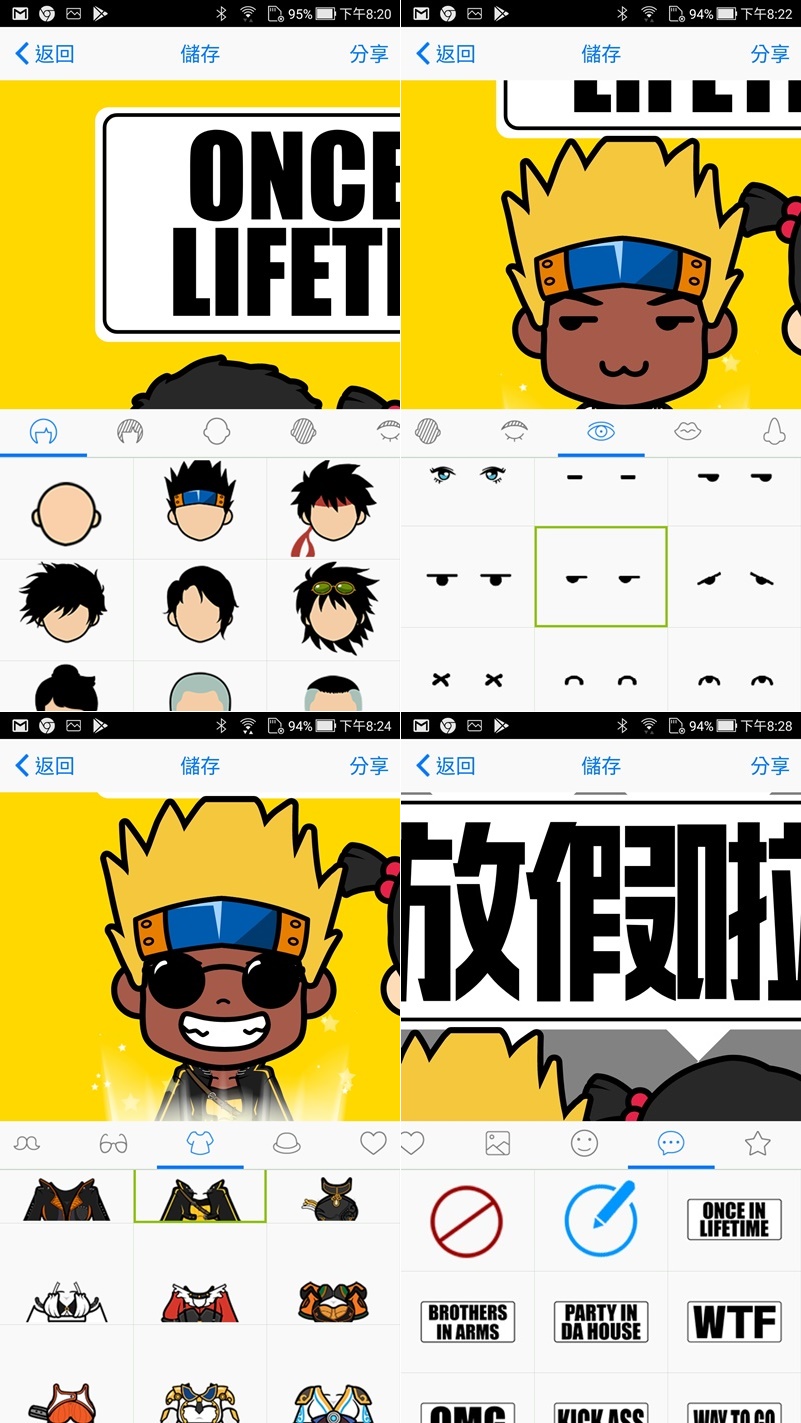美圖秀秀之類,除了用原照片生成,也能使用「FaceQ」自己做,包括髮型臉型、髮色皮膚色、五官樣式、衣服、眼鏡或帽子等飾品,還有手擺的動作、背景圖樣、對話框都能自行設定,不需要任何美術天分也能隨便做出一張可愛又趣味的大頭貼。