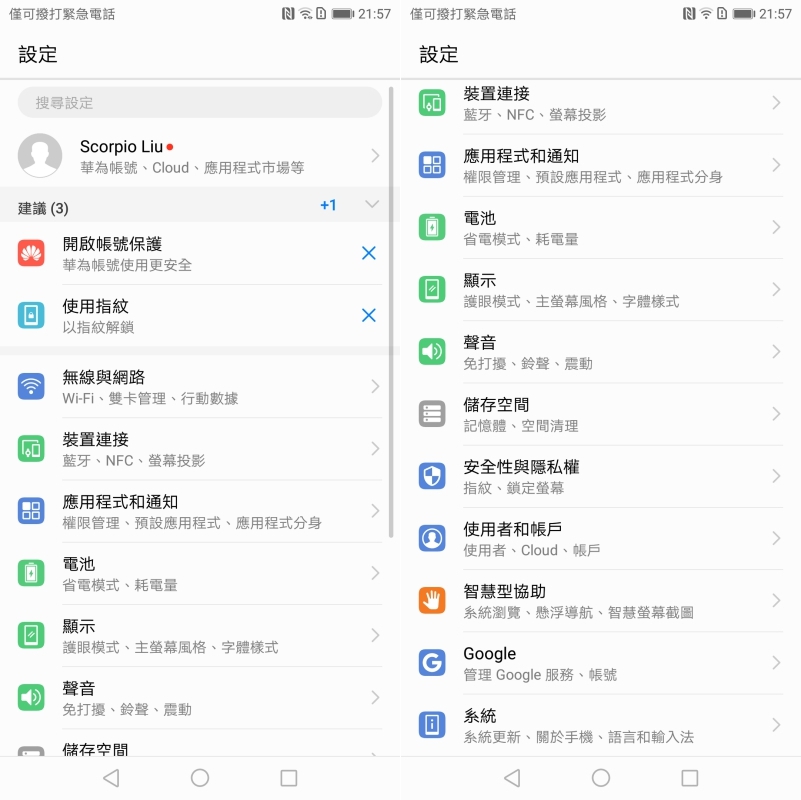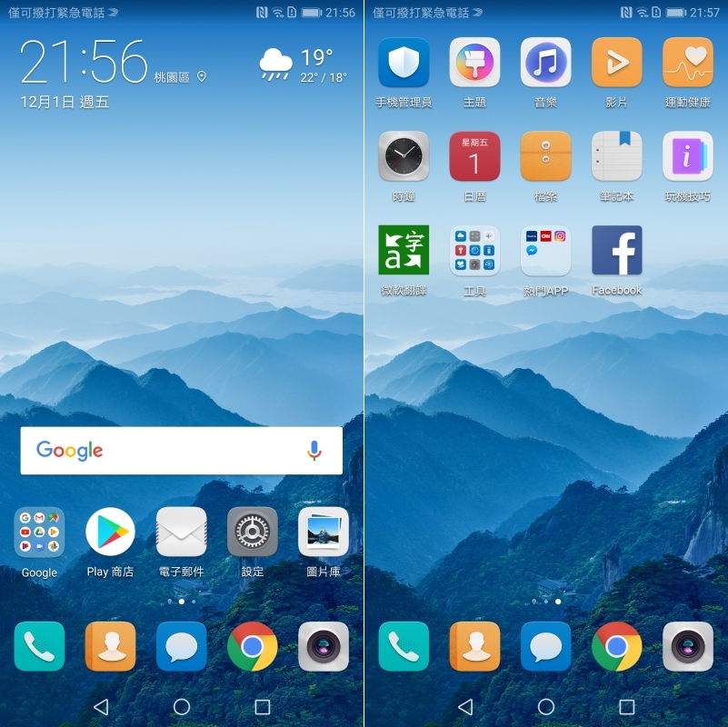 介面採用華為自家開發的 EMUI 8.0(基於 Android 8.0),主畫面可以自行在設定裡選擇像這樣全部的 APP 都在桌面上,或者有收納 APP 抽屜的畫面,都可以依自己的習慣去選擇。