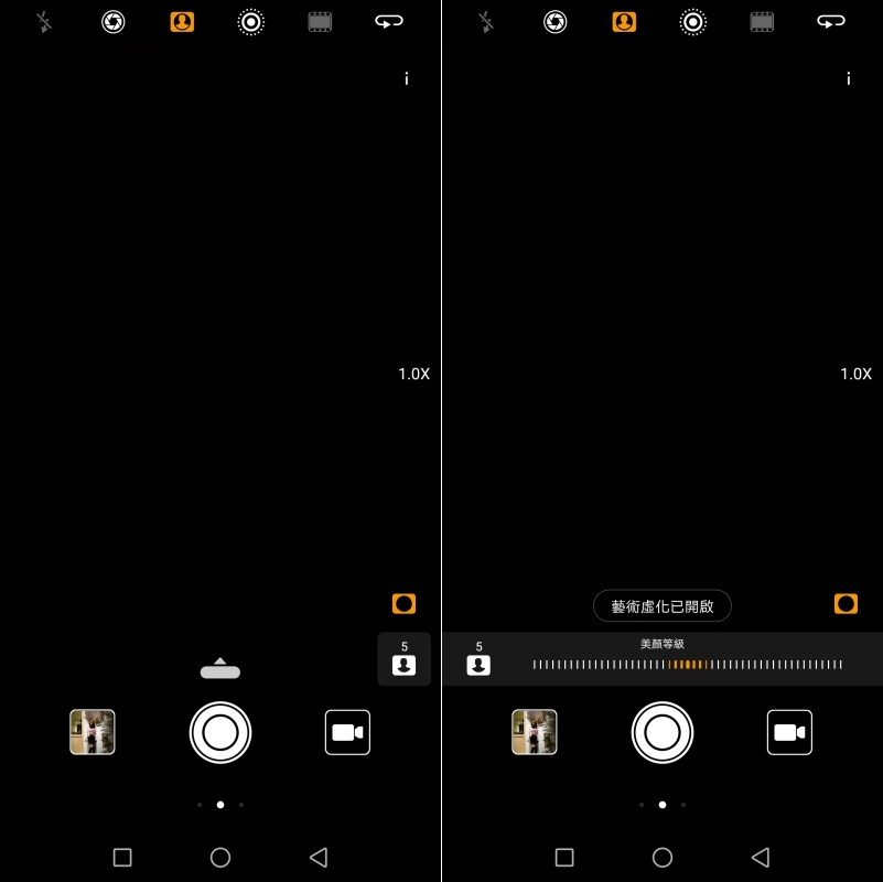給大家看一下美顏等級,左圖是 0 未開,右圖為最高等級 10 全開,也不會太過度美化,但我臉上的.... 各種紋路,都幫我消除了,年輕十歲啊!