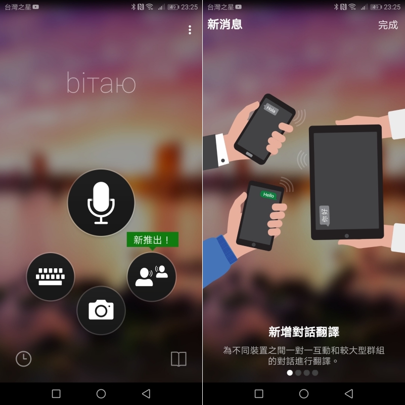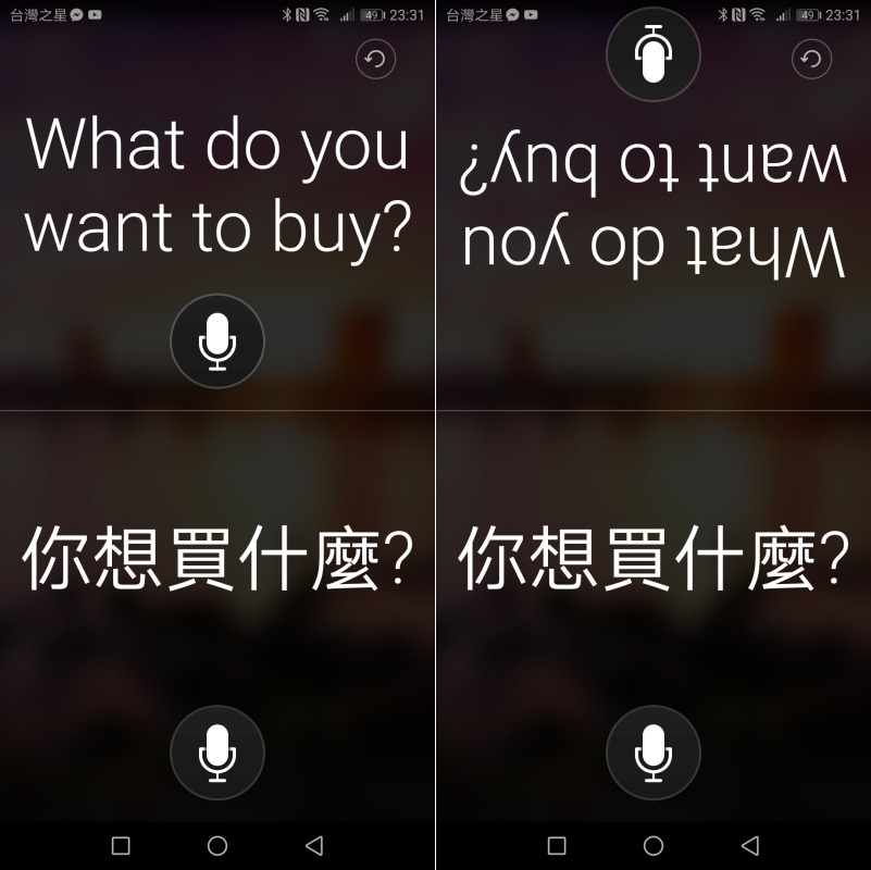 如果你在國外旅遊的話,可以切換成雙向語音翻譯功能,對方的畫面你可以自行切換方向,像是右圖,就很適合做雙向對話,我只要按一下講話後,對方那邊就會顯示翻譯結果並播放聲音,而對方同樣按一下就可以講話,這麼一來就可以進行簡易的雙向對話了,是不是很方便?