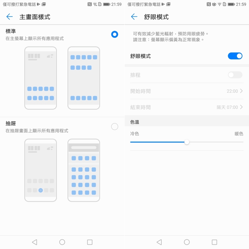 想要選擇主畫面樣式在設定裡可以找到,另外針對舒眼模式(護眼),一般都只能切換,在 Mate 10 Pro 裡則是增加了排程功能,像阿湯跟老婆的習慣是晚上切換成舒眼模式會比較舒服,就可以排程晚上的時間自動切換,就不需要自行手動選擇。