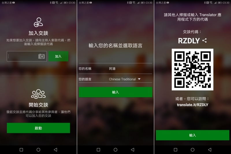 而對話翻譯可以選擇加入別人的聊天室也能自行創建,使用很簡單只要選擇自己的語系跟䁥稱就可以了,別人加入可以透過 QR Code 或是輸入代碼。