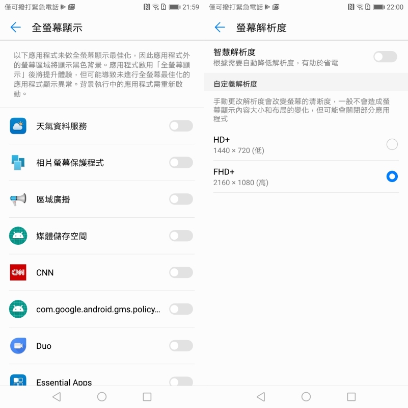 雖然現在陸陸續續愈來愈多全螢幕的手機推出,不過有不少 APP 還沒針對全螢幕的顯示進行更新調整,但可以在全螢幕顯示中自行選擇哪些尚未最佳化的 APP 是否要使用全螢幕顯示,阿湯試了蠻多個 APP,切換全螢幕顯示大致上都沒有問題。