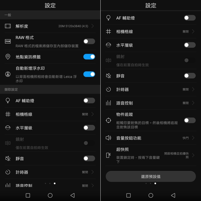 在設定中也能選擇拍攝 RAW 檔、加入華為的浮水印等設定,如果想要學習拍照構圖,可以試著開啟相機格線,保證讓你拍攝能力立刻提升。