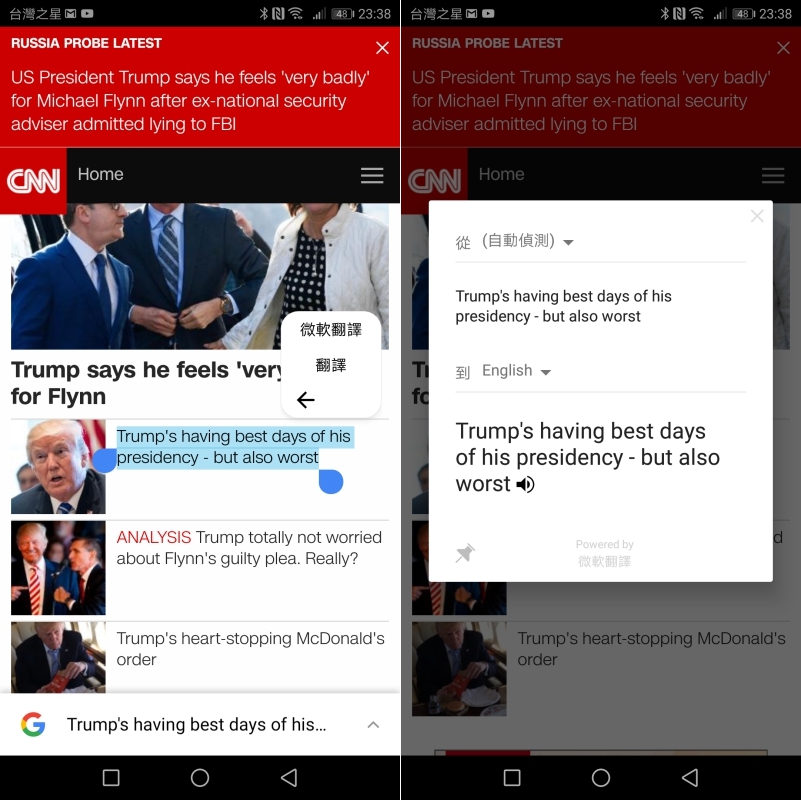 而華為與微軟合作的定制版翻譯 APP 其實一般手機也能安裝使用,上述的功能也都有,但是 Mate 10 Pro 有專用的內建晶片可以讓翻譯速度更快,除此之外還多了網頁翻譯功能,可以直接在網頁選擇內容後直接進行翻譯,這是在 Mate 10/10 Pro 上獨有的哦。