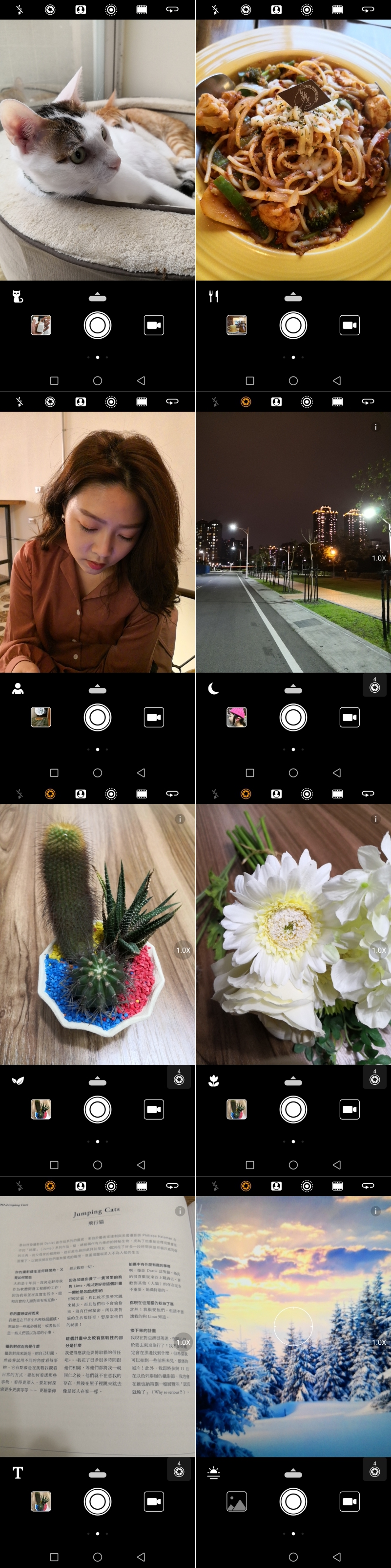 那你怎麼知道有沒有偵測到這 13 種場景呢?阿湯也實際針對這些場景進行了測試,當符合偵測內容時,在下方的最左邊會出現對應的圖示,下面阿湯也提供其中八種場景的實際偵測截圖給大家,真的蠻準確的,而且像是貓跟狗不一定要正臉,側臉或是上方同樣都能偵測到。
