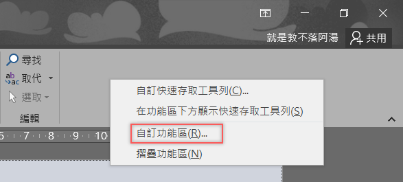 先在上方功能區隨便一個地方點右鍵 → 自訂功能區。