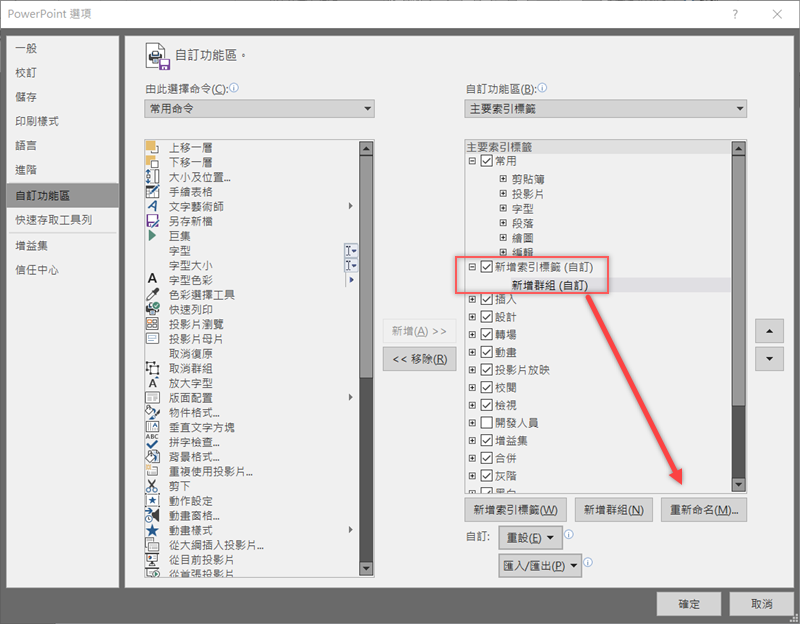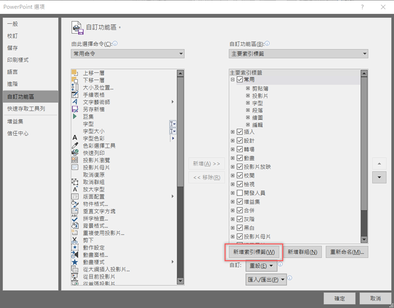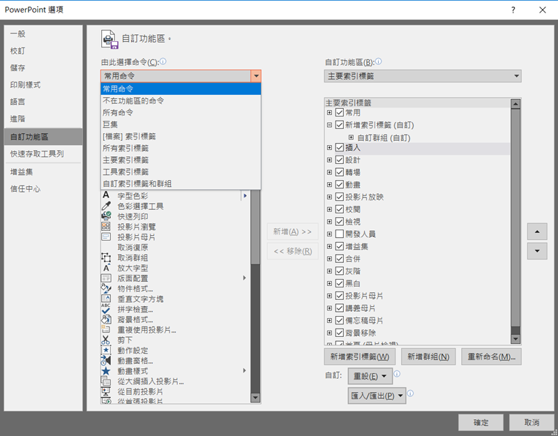 回到自訂區,在左欄你可以切換成常用、不在功能區或所有命令,索引標籤類型也能選擇想要顯示的項目。