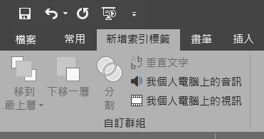阿湯是叫出原本不在功能區的命令,並將需要的項目一一新增到右欄的自訂群組,像是上下移一層、分割圖案、文字藝術師垂直文字,以及加入電腦裡的音訊、視訊,數量沒有限制但不建議太多,失去快捷的本意。
