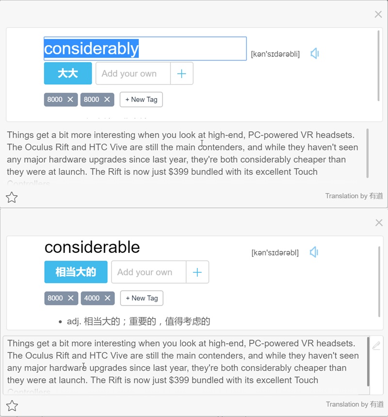 就會幫你翻譯並發音,可自行加入字義及標籤,底下的例句則是從文章中單字的前後文截取的。
