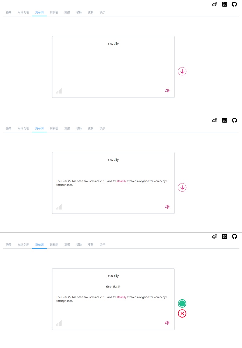 開始後會先顯示單字,在右邊按下一步出現例句,再按一次出現字義,答對就點「○」,以此類推,整個完成後會以圓餅圖顯示答對 ∕ 錯的題數。