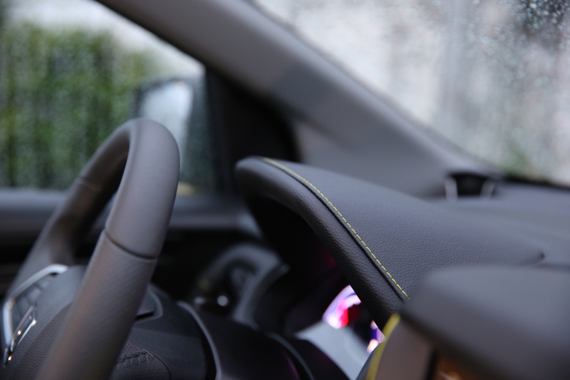 大家注意到了嗎?內裝隨處可見跟車色一樣的青曜黃縫線,車內外的配色相互呼應,這也是頂級的旗艦 Vogue+ 版本才有的,非常的好看。