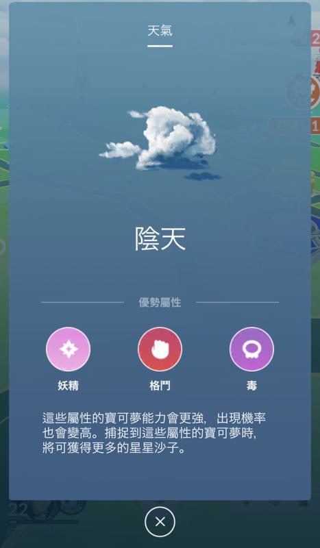 更新後我們可以發現在遊戲畫面的右下方會出現一個天氣的符號,只要點選該符號就會出現目前的天氣狀況以及適合對戰的寶可夢屬性,符合該天氣對應的寶可夢出現機率和星星沙子也會增加。