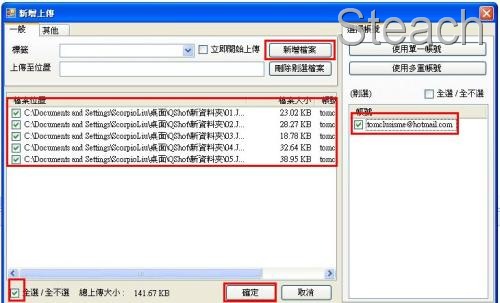 按下新增檔案,選擇你要上傳的圖片或檔案(可一次選取大量檔案),將欲上傳的圖片或檔案勾選,再勾選你要上傳的帳號(右框),按下確定加入(如果立即開始上傳有勾選,按下確定後會直接開始上傳)