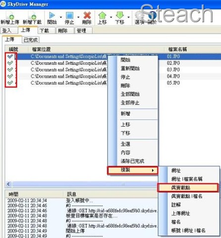 當圖片或檔案上傳完畢後,前方會變成打勾的狀態,如果要取得真實位址,只要在你的檔案右鍵→複製→真實載點,然後再貼到你要使用載點的地方就可以囉,如果你要一次取得全部的載點,則選取全部的檔案右鍵複製即可,像是要編輯部落格的人,就可以先將取得的載點全部貼到記事本,在編寫文章時,再一一加入就可以囉!!
