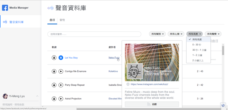 提供創作者的 IG 資訊,有興趣可以點追蹤,另外也能從時長或聲樂類型(合奏、有無人聲、男聲或女聲)去篩選。