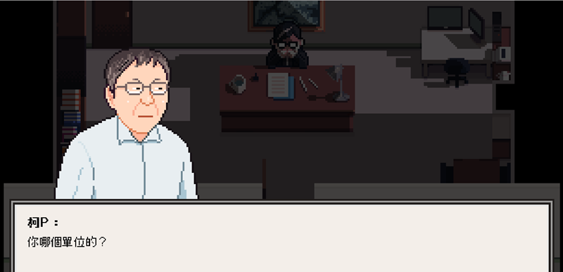 按下開始進入畫面,看到熟悉的柯 P 變身電玩人物還蠻好笑的,第一句就是市長口頭禪「你哪個單位的?」跟神秘人進行一小段對話。