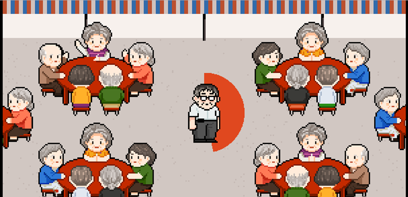 每道關卡最後都會展示一項政績,並以一項簡單的挑戰來破關,像第一道就是老人共餐。