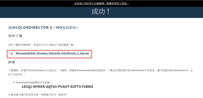 訊連科技的一系列活動取得步驟都相同,為了沒用過的朋友阿湯還是會帶一次,阿湯示範的網頁已經過自動翻譯,如果你連上的是英文版也不用擔心就照著做,先點中間橘色那條。