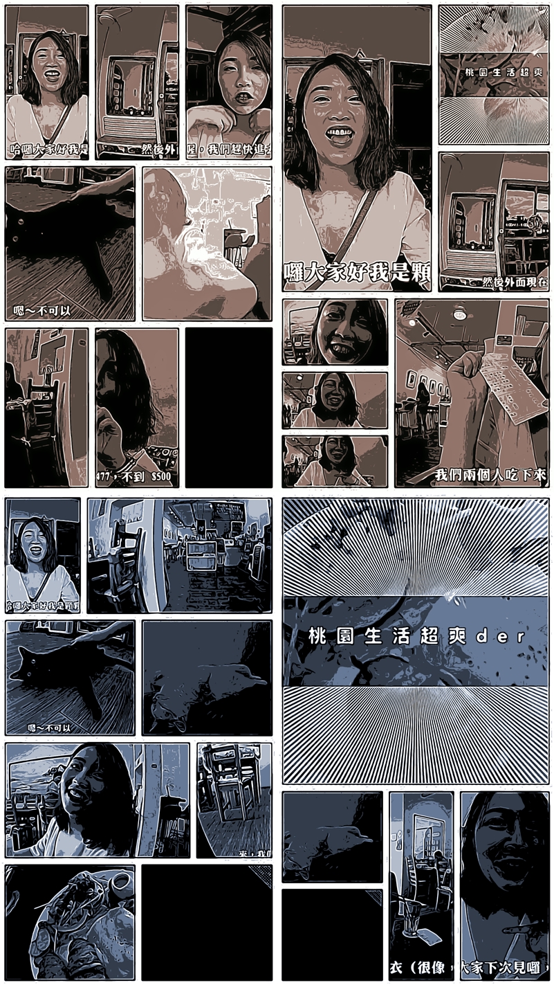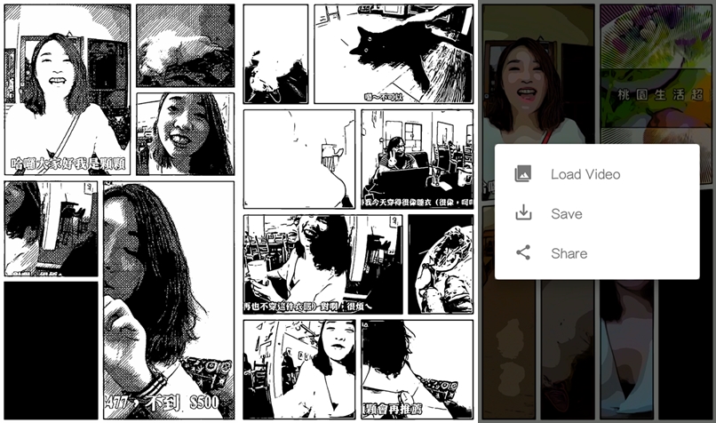 產出的連環漫畫以單張拼圖的方式呈現,劇情並沒有連續,據 Google 說是 AI 幫你計算出這段影片的重點是哪些畫面,再把它們變成漫畫,點圖片就可儲存或分享出去。