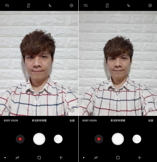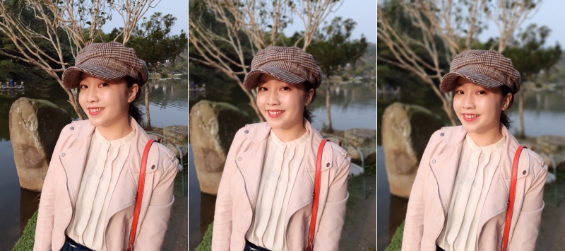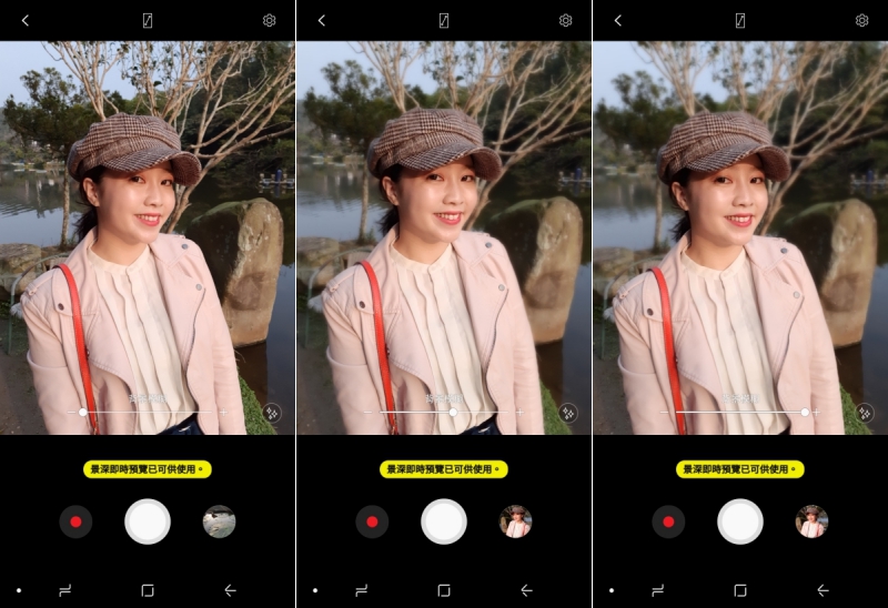 而這次最值得注意的就是自拍功能,加入了雙鏡頭設計,可以拍攝出更好的景深效果,在自拍時只要點擊景深即時預覽就可以啟用,在拍攝時也可以調整景深程度,下圖左中右分別是無景深、50% 跟 100% 的預覽,拍攝成像可以往下來看。