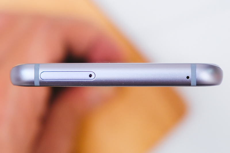 上方為 microSD 記憶卡槽以及 SIM 卡槽(SIM2),右側小孔為麥克風收音孔。