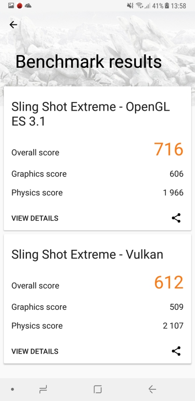 3DMark 透過 Sling Shot Extreme - OpenGL ES 3.1 獲得 716 分,Sling Shot Extreme - Vulkan 獲得 612 分。