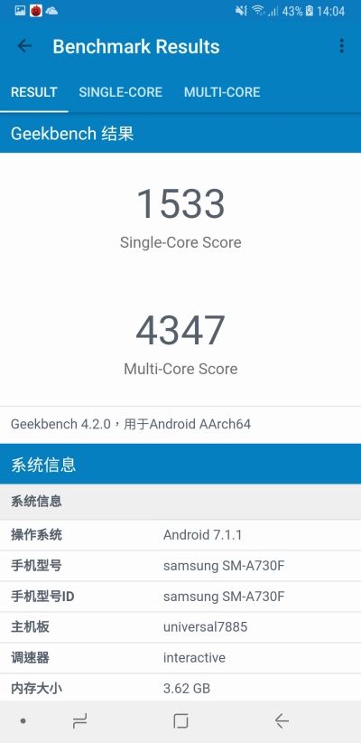 Benchmark 單核獲得 1533,多核則獲得 4347。